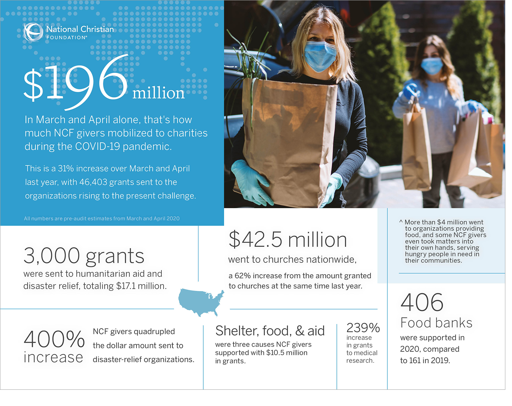 At a time when churches and charities need it most, NCF givers have stepped up with critical support in response to the COVID-19 pandemic. In March and April alone, they mobilized more than $196 million in grants from their Giving Funds (donor-advised funds) – $50 million more than the same time frame last year, a 31 percent increase.